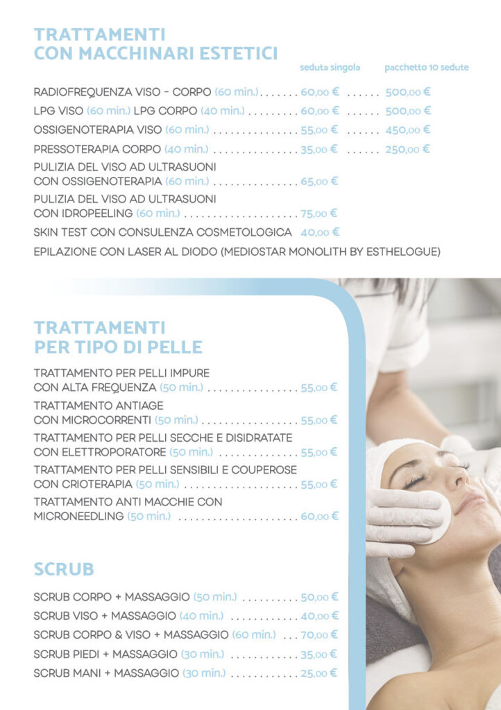 Trattamenti per ogni tipo di pelle: alta frequenza per pelli impure, elettroporatore per idratare pelli secche e disidratate, crioterapia per calmare le pelli sensibili, trattamenti antiage con microcorrenti per combattere i segni del tempo e nanoneedling per ridurre le macchie cutanee. A completare: pulizia del viso ad ultrasuoni ed idropeeling per pulire la pelle in profondità.