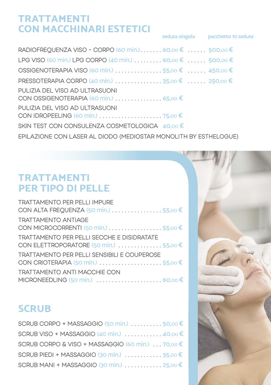 Abbiamo creato dei veri e propri protocolli di bellezza che prevedono l’utilizzo dei macchinari, la nostra linea di skincare ma soprattutto dei momenti di vero e proprio relax.