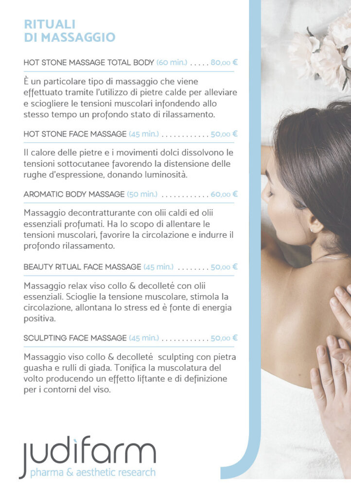 Judifarm offre trattamenti mirati a rigenerare e rimodellare il tuo corpo. La pressoterapia stimola la circolazione, riduce il gonfiore e favorisce il drenaggio linfatico, mentre gli scrub corpo e viso eliminano le cellule morte, lasciando la pelle morbida e luminosa. I rituali di massaggio e con hot stone rilassano mente e muscoli, alleviando lo stress e migliorando il benessere generale. La radiofrequenza corpo è ideale per tonificare i tessuti e contrastare la perdita di elasticità. Ogni trattamento è pensato per esaltare la tua bellezza naturale, donandoti una pelle levigata e un corpo armonioso.